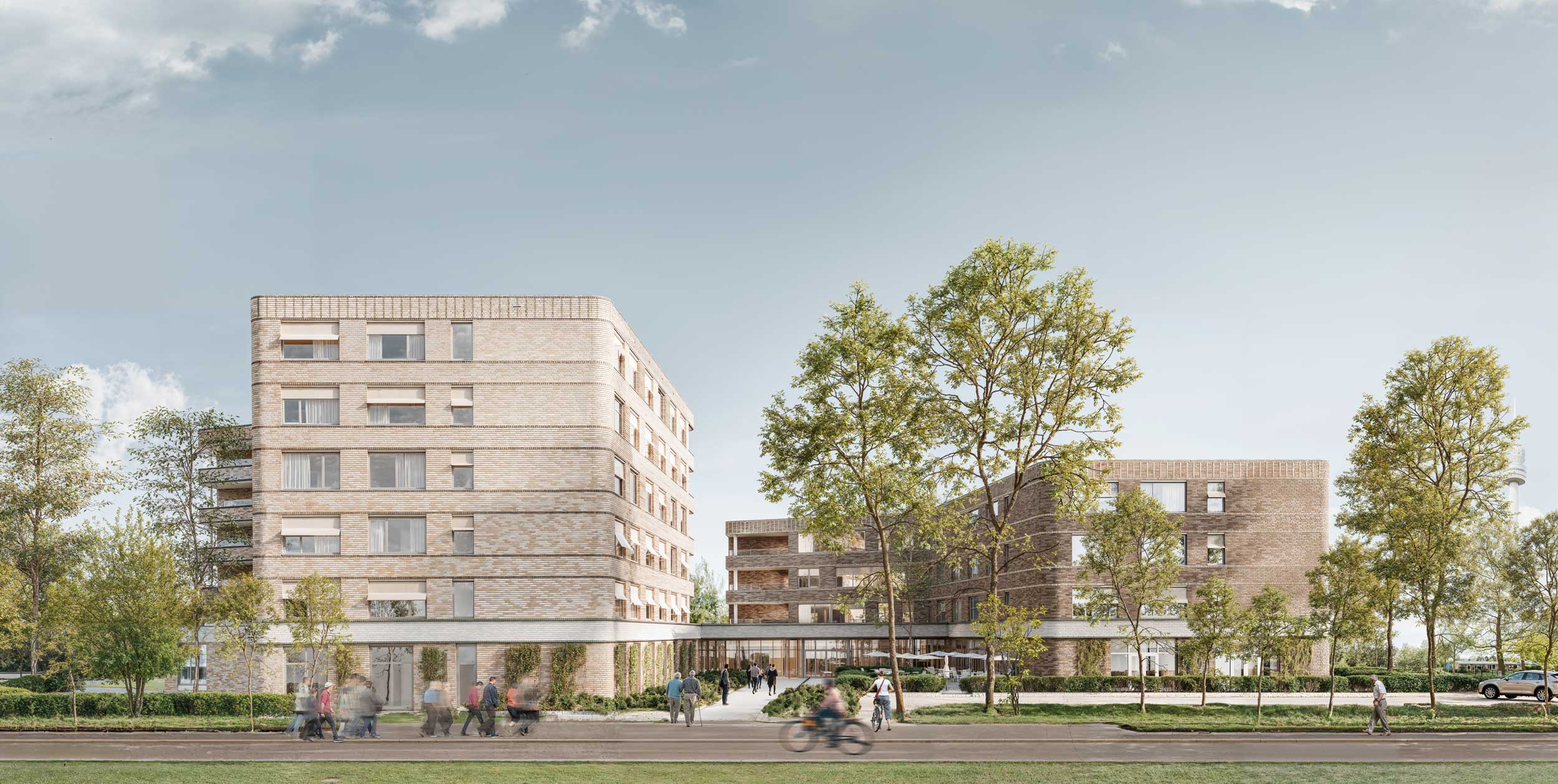 Het ontwerp bestaat uit vier bouwvolumes met wisselende hoogtes, verbonden door een transparante plint met entrees en gemeenschappelijke functies zoals een brasserie. De opzet opent zich naar wijk, park en tuin en creëert groene tussenruimtes die uitnodigen tot beweging en ontmoeting.