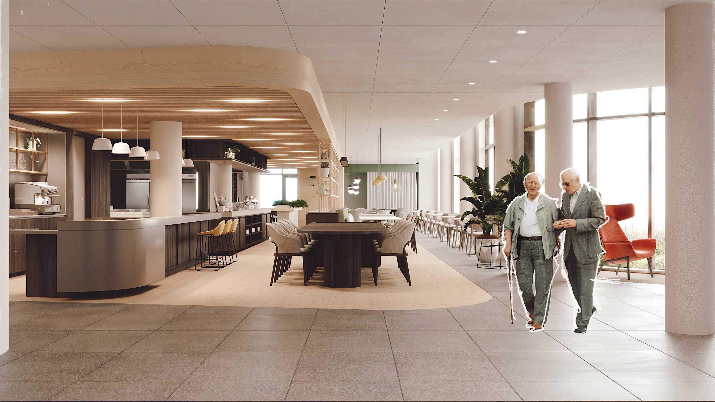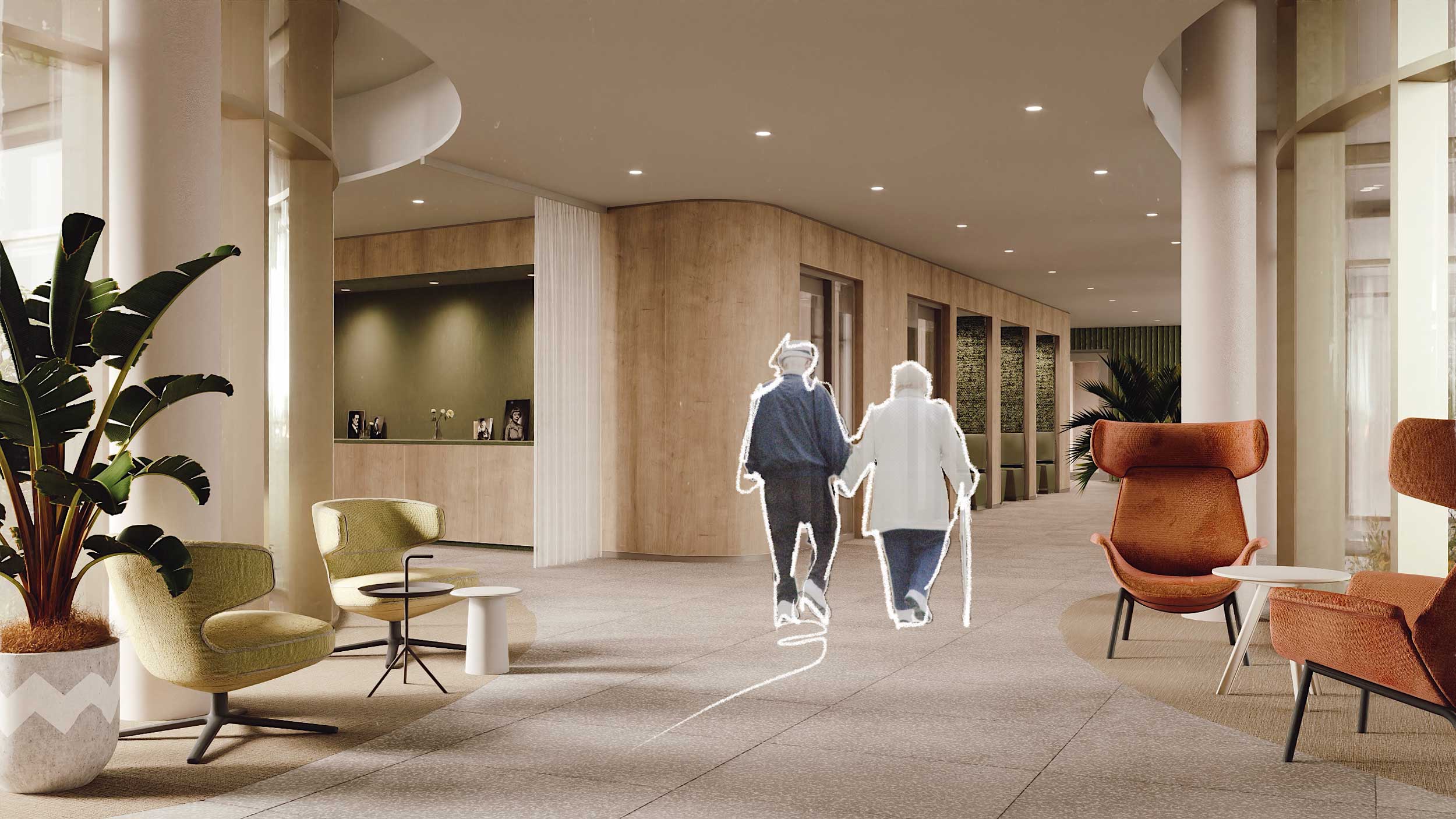 Binnen zorgen compacte woongroepen voor herkenning, rust en spontane beweging; buiten bieden tuin en park directe aansluiting op de omgeving. De indeling is tegelijk gestroomlijnd voor korte looplijnen en goed overzicht, zodat zorgprocessen efficiënt én veilig verlopen.